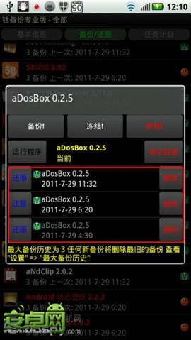 另外,在备份/恢复的程序列表里短按任意程序还可以看到该程序的备份详情,你可以点击还原按钮还原 单个程序,也可以删除其对应的备份。已卸载的程序也能通过点击“删除已卸载程序的备份”按钮来删除 它的备份: