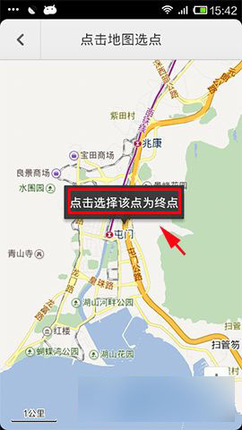 2)点击地图选点,找到你要去的地方,点击选择该点为终点;(如下图所示)