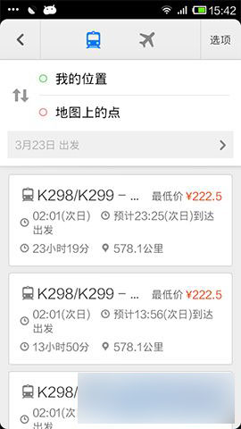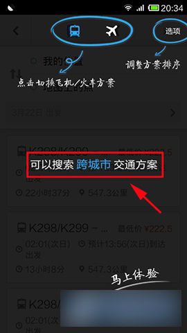 3)随后出现跨城市交通方案,可切换飞机/火车方案,还可以调整方案排序,点击马上体验,此时就可以查看到详细方案了。(如下图所示)