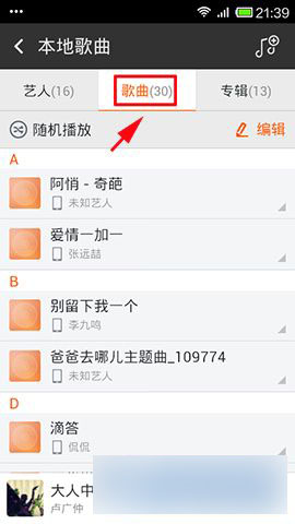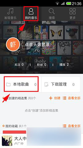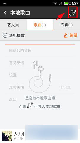 1)打开虾米音乐,点击我的音乐,再点击本地时歌曲,再点击本地歌曲上方的那个音乐符号;(如下图所示)