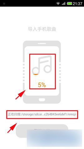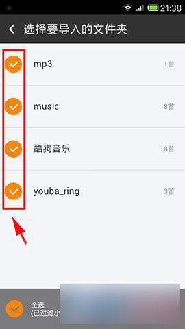 2)出现正在扫描手机歌曲,扫描完后会出你手机里的全部歌曲(注该扫描已过滤小于500K的小文件),可勾√号选择你要导入的文件夹;(如下图所示)