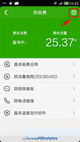 1)首先打开360手机卫士。点击防吸费,进入后点击右上角的设置键;(如下图所示)