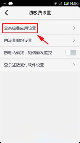 2)出现查杀吸费应用设置,防流量偷跑设置,防电话偷拨,短信偷发监控,和查杀盗版支付软件设置。先点击查杀吸费应用设置,这个已经√选好的,开启应用安装时自动检测。这可以帮助我们不会下载到有吸费的应用;(如下图所示)