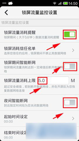 3)锁屏流量监控设置,可设置锁屏消耗信任名单,把你常用的应用可以添加到里面去。还可以开启锁屏期间智能断网,当流量消耗达到一事实上阈值时断开数据网,锁屏流量消耗上线可根据你实际情况自定义数值。夜间智能断网,可根据自己晚上休息时间不上网的时候设定好时间。(如下图所示)