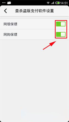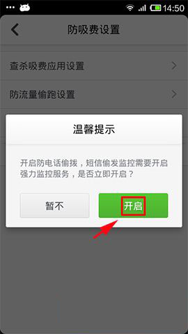 4)防电话偷拨、短信偷发监控,点击开启即可(注:这个需要ROOT后才能使用这功能),查杀盗版支付软件设置,这个切记不要关闭,可保护你的财产安全。(如下图所示)