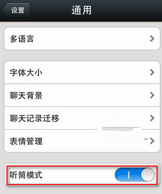 在“通用”界面可以看到“听筒模式”切换按钮,灰色表示微信没有开启听筒模式哦~(微信5.2默认使用扬声器播放语音)
