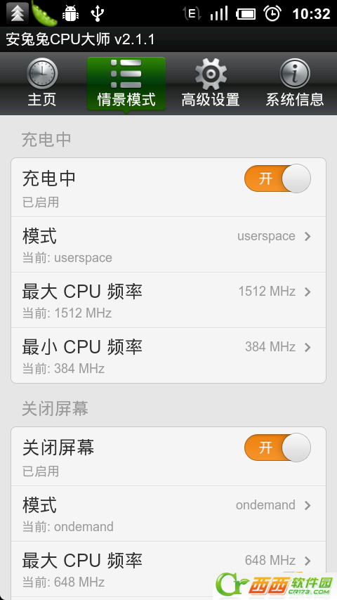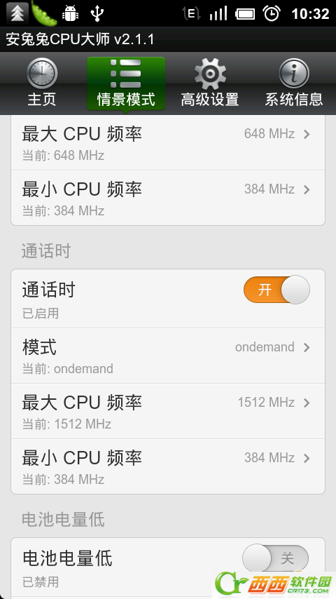 在安兔兔CPU大师的情景模式中,我们还可以设置更多的不同情景模式下的CPU频率使用: