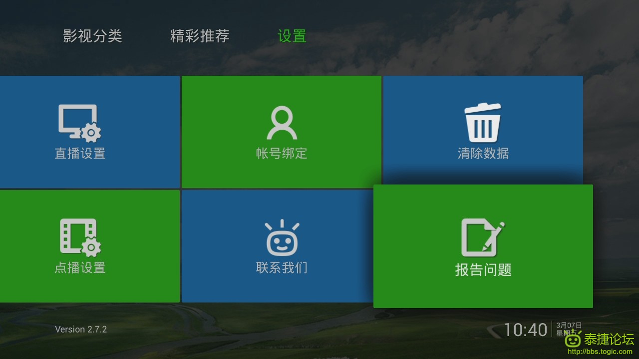 1、播放遇到问题后打开电视上的泰捷视频,找到“设置”——“报告问题”