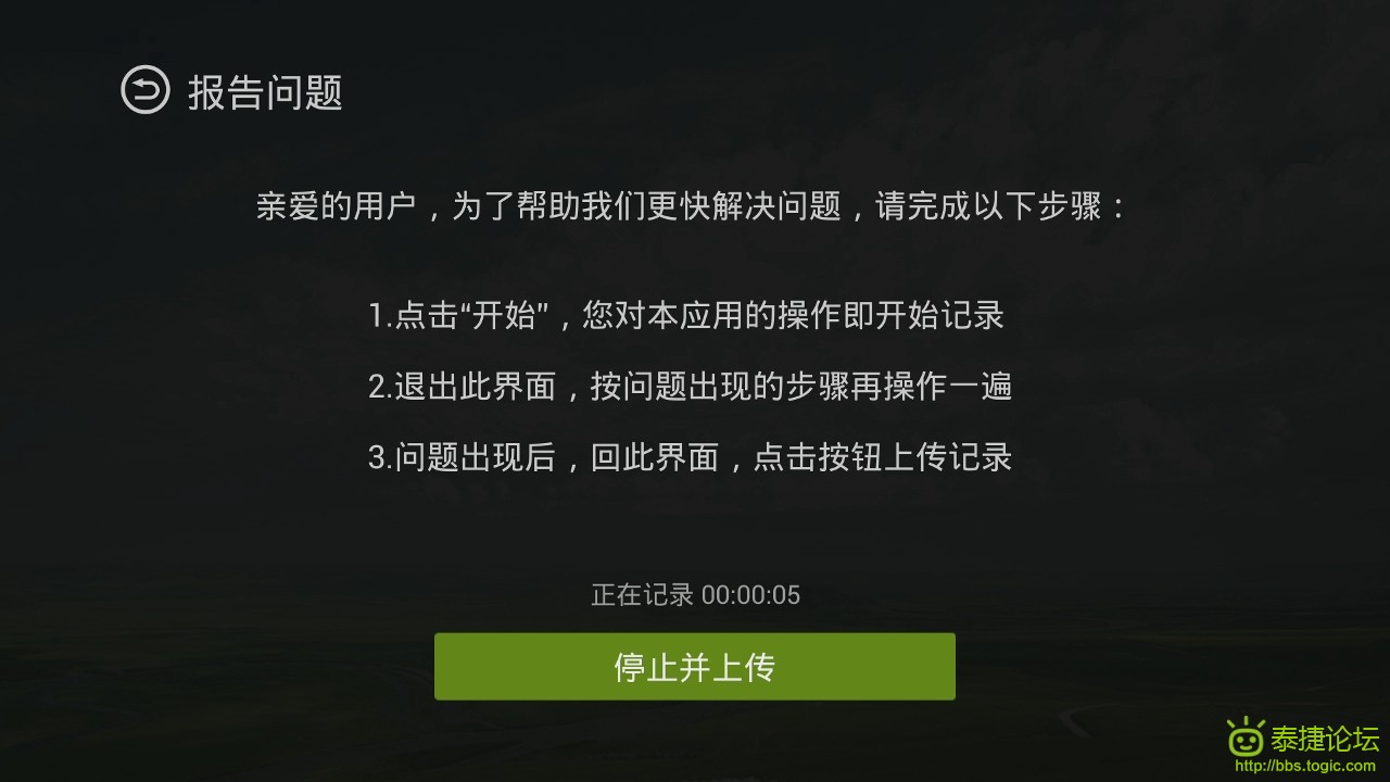2、打开“报告问题”,按遥控器“OK键”点击“开始”,开始记录问题,