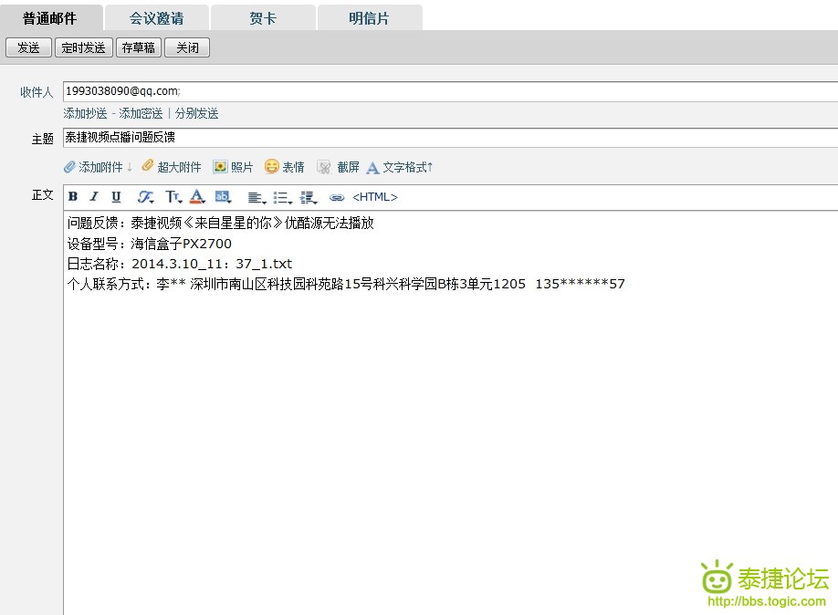 5、发送邮件到:1993038090@qq.com,通知泰捷技术人员。邮件内容包括:问题描述+设备型号+日志名称(如下图红框标记)