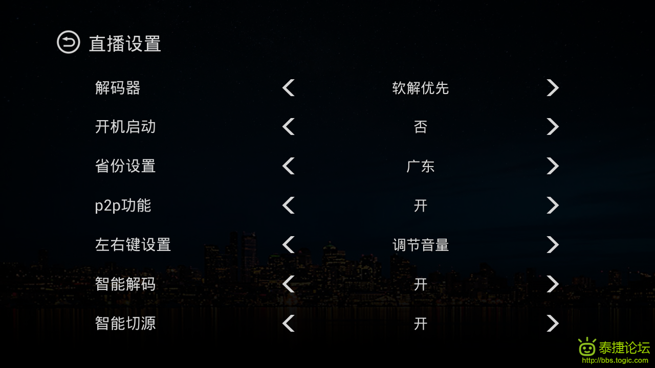 泰捷视频TV2.7.4的直播设置里面有“解码器”、“开机启动”、“省份设置”、“P2P功能”、”左右键设置”、”智能解码”、”智能切源”几个选项