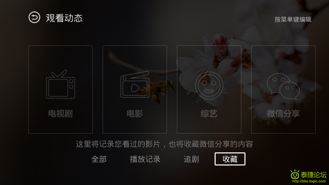 泰捷视频TV2.6版之后,已经把播放记录、收藏、追剧、猜你喜欢这些信息集合到观看动态当中,如果清除播放历史,只需要选择“播放记录”按遥控器上的"菜单键"(menu)即可删除播放记录,目前观看动态当中暂时只支持逐个删除,还不支持多个删除,在设置中有一个”清除数据“的选项,选择你要清除的数据项即可清除数据。