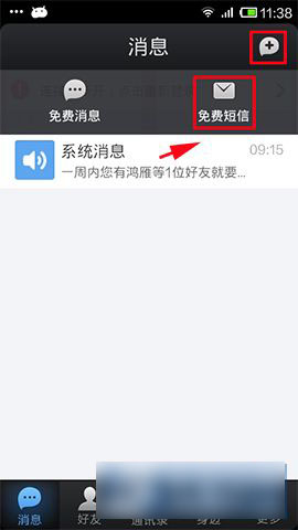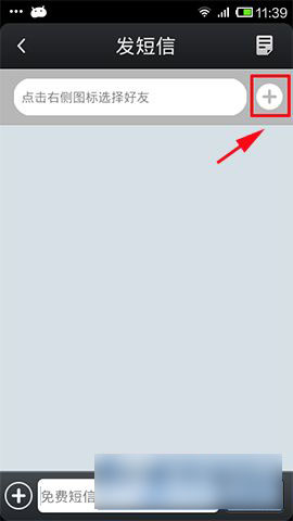 1)首先登陆飞信云聊版软件,点击消息上方的符号,再点击免费短信,再点击右侧图标选择好友;(如下图所示)