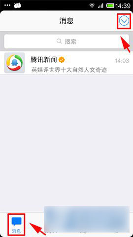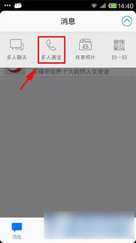 1)首先打开手机QQ,点击消息,再点击消息旁的下拉框,随后再点击多人通话;(如下图所示)