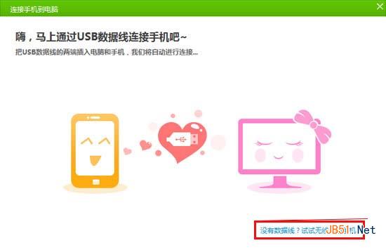 2)如果想使用“无线连接手机”就别用USB数据先连接电脑,直接点击右下角,“没有数据线?试试无线连接手机”。(如下图所示)