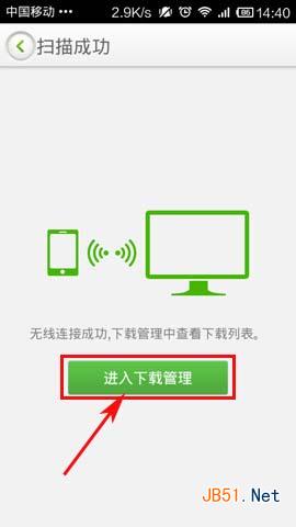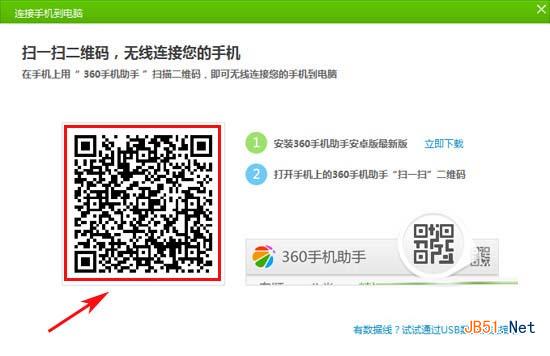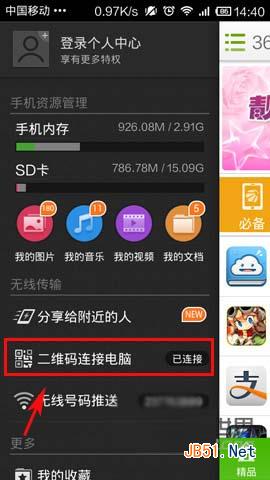6)在跳转到二维码扫描界面后,对准刚才PC端360手机助手的二维码进行扫描,待扫描后点击进入,无线连接电脑就已经完成了。(如下图所示)