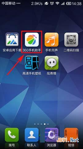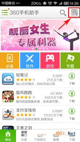 5)先在手机端下载好“360手机助手”,下载好后点击进入,在主界面点击右上角“二维码”图标进入。(如下图所示)