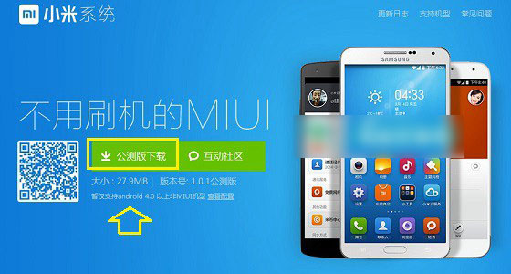 一、首先在手机中下载小米系统,大家可以直接通过扫描一下二维码下载;另外也可以直接点此进入小米系统网站下载,进入后,点击“公测版”下载即可,(本站也提供了小米系统公测版的下载,不想麻烦的朋友们可以直接点击该下载)如下图所示: