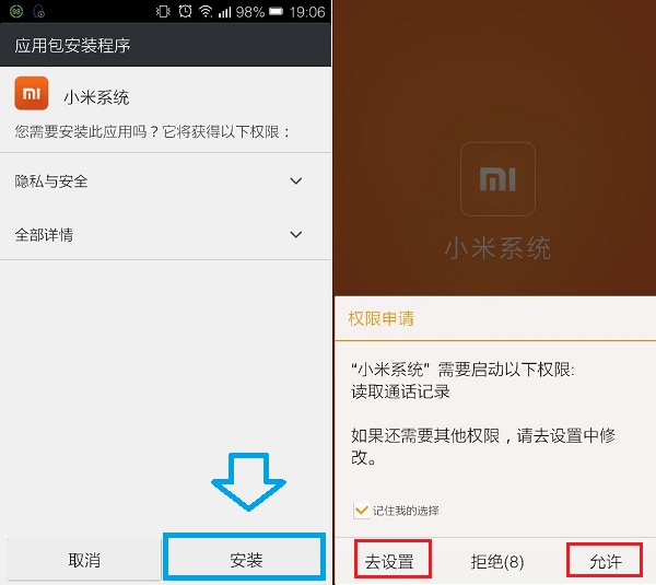 二、下载好小米系统后,我们传到手机当中,或者直接在手机中下载好,然后打开安装,在安装的过程中,会提示需要申请通话记录权限,我们这里选择“允许”即可,如下图所示:
