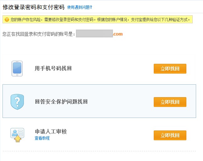 (若您的手机号码不用了,或者安全保护问题忘记了,请您选择【申请人工审核】,根据邮件提示提供相应的证件给我们,支付宝收到核实后会在48小时内处理)