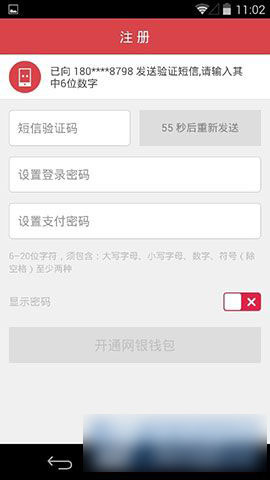 1)首先下载一个“网银钱包”,然后点击打开“网银钱包”,就可以看到“注册”,然后在“注册”中输入手机号码。(如下图所示)