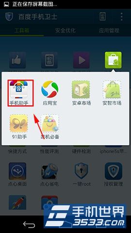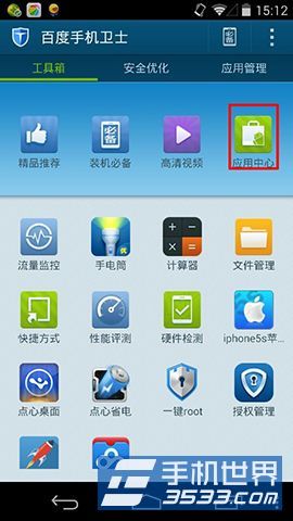 2)然后在百度手机卫士的工具箱中,点击进入“应用中心”,然后在点击“手机助手”