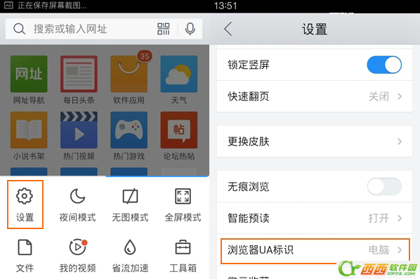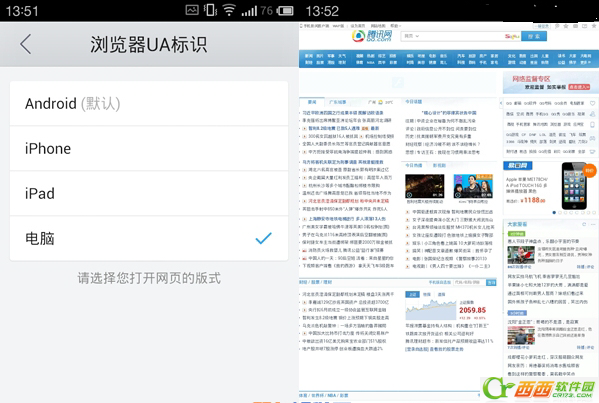 打开“浏览器UA标识”,用户就能看到不同的UA标识,有Android、iphone、ipad和电脑。如何想把浏览效果变成电脑的话,那么就选择“电脑”。选择完后,输入一个网站查看,原本的手机浏览效果就变回电脑版的浏览效果了。