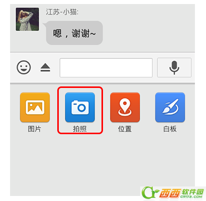 2、在对话框中点击输入框左侧的“+”,选择“拍 照”。需要说明的是,在此前的版本中,这一步 应该是点击“图片”的。但在最新的手机QQ201 3(4.2.0版以上)必须点击拍照才能实现。如图: