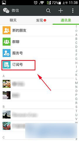 1)首先打开“微信”,然后在“微信”的通讯录中点击进入“订阅号”。(如下图所示)