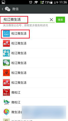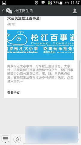 2)在“订阅号”中添加“松江微生活”这个公众号,然后点击进入“松江微生活”这个页面。(如下图所示)