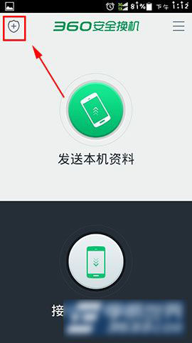 1)首先打开“360安全换机”(点击下载),然后在左上角的“+”中点击进去。(如下图所示)