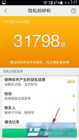2)系统会自动扫描隐私的信息,扫描完毕之后点击“立即粉碎”就可以把资料全部删除掉了。(如下图所示)