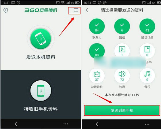 360安全换机APP应用实用非常简单,首先在新旧手机中,同时安装360安全换机应用,安装后,打开应用界面,然后点击“发送本机资料”操作,完成后,同样在新手机中安装“360安全换机应用”,然后点击“接受旧手机资料”,如下图所示: