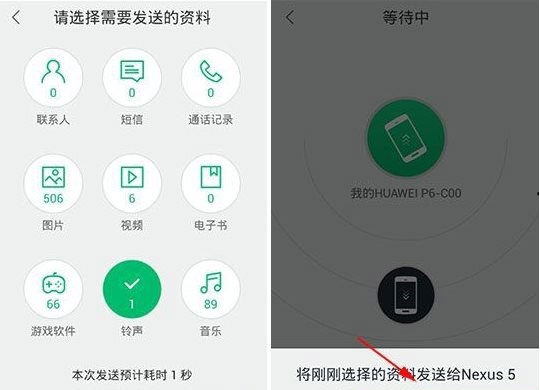 接下来我们只要在旧手机中选择需要发送到新手机的资料数据,可以使通讯记录、联系人、聊天记录,以及游戏等都可以传送,选择完需要发送的文件后,再点击下方的“发送到新手机”,即可,此时系统会自动查找到新手机,然后点击“发送”即可。