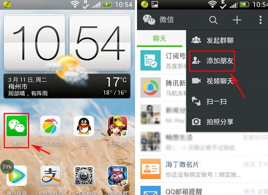 1、首先打开微信,进入首页,点击“三点”按键,然后在显示出功能列表中按“添加朋友”按键。
