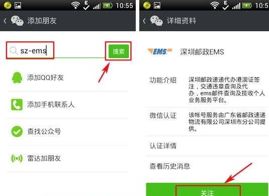 2、进入添加朋友界面,在搜索框内输入sz-ems后,点击“搜索”按键,在搜索成功后,按“关注”按键。