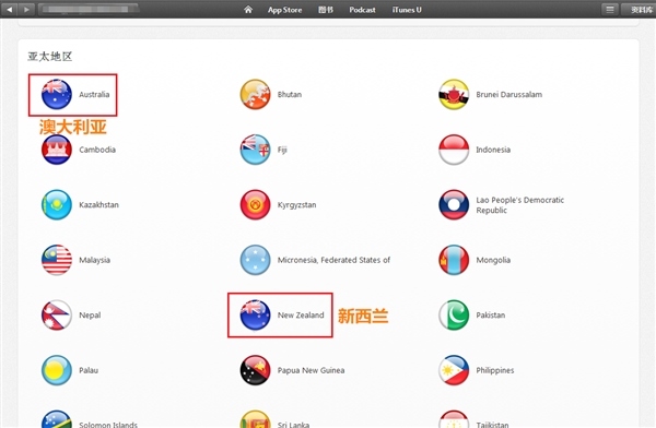 第一步:找到对应下载区。打开你的itunes,如果当前区域并非的新西兰区、加拿大区或澳大利亚区,请点击iTunes底部右下角的中国图标按钮,点击后进入地域选区;