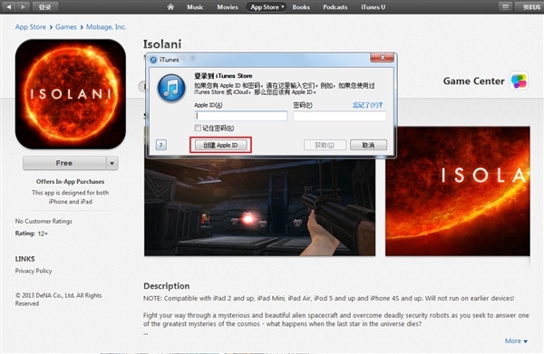 点击Free按钮后,在弹出的登陆框中点选“创建Apple ID”.