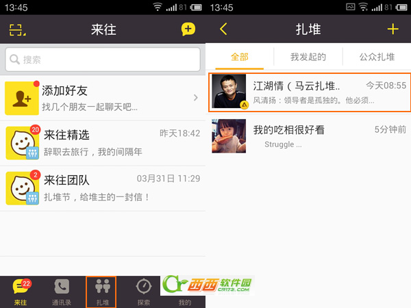 从我们第九软件网中下载最新版的来往5.0,在手机上进行安装。打开来往软件后,会发现界面焕然一新。黄色的格调,特别的好看。进入来往之后,在底部栏中点击“扎堆”功能进入。进入后,选择一个自己经常看的扎堆。