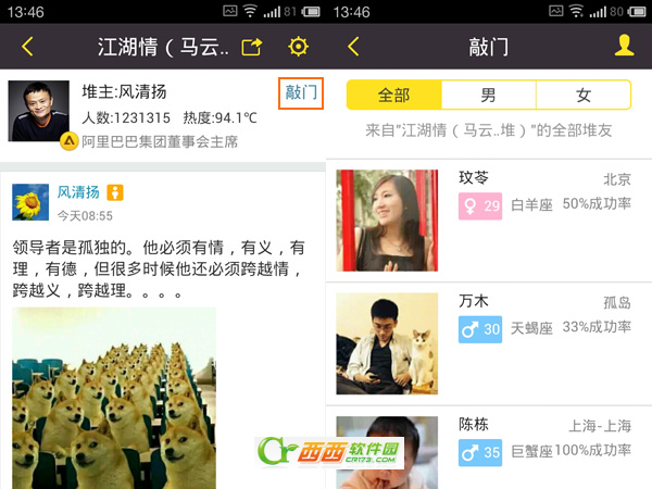 选择了扎堆群之后,点击进入。细心的用户就会发现右上角发生的变化。是的,新增了敲门功能。点击“敲门”我们就可以选择堆友进行敲门了。