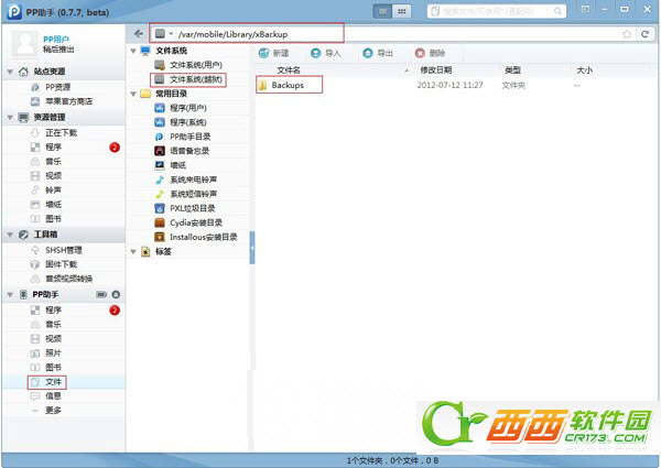 2.将设备连接电脑,打开pp助手--文件--文件系统(越狱)--路径:/var/mobile/Library/xBackup--将路径内的“Backup”导出本地电脑。