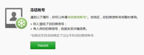 1、首先请进入110.qq.com 申请微信帐号冻结,或联系微信的客服申请冻结微信帐号,以保证帐号信息的安全及避免盗号者利用帐号进行欺诈行为。