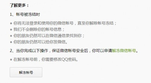 3、QQ密码修改成功后,请通过电脑登录110.qq.com,点击“解冻帐号”即可解除微信帐号的冻结,微信号可正常登录。而在你再次登录微信账号时,微信还会发送一条验证码信息到你此前绑定的手机里。