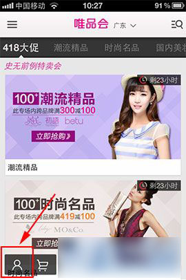 1)打开“唯品会”(点击下载),点击左下角“个人中心”;(如下图所示)