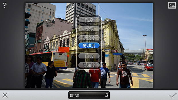 在程序中打开图片, 选择屏“TUNE IMAGE”,之后上下滑动手指,选择亮度、对比度、阴影等选项,左右滑动来增减效果程度。这里增加饱和度和阴影的值,点击对勾应用。
