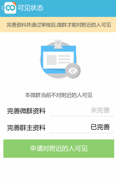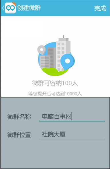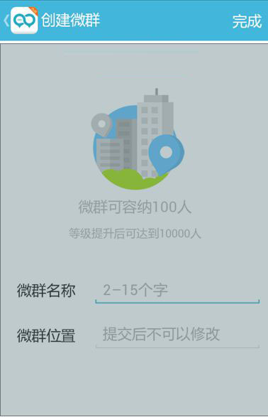第四步:选择完位置之后,我们点击完成,此时会提醒我们邀请好友,我们选择跳过,就可以去完善微群资料额。