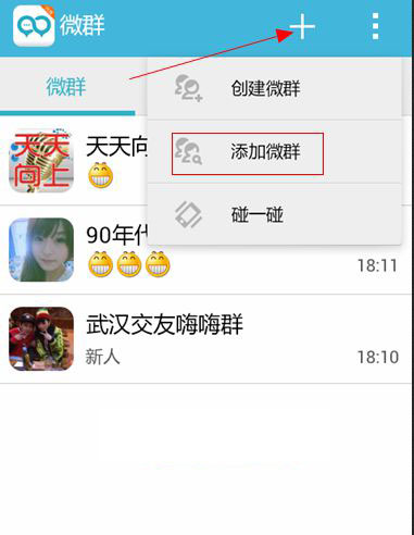 第一步:登陆微群组,进入微群组应用界面,点击+ 图标,点击创建微群。