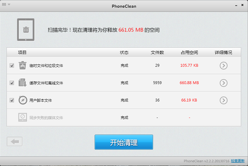 扫描完毕之后,会提示此次释放了多少空间,每项垃圾文件占用空间多大。
