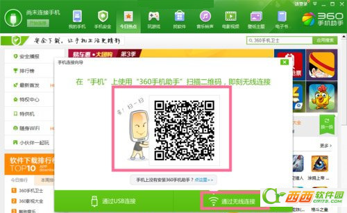 360手机助手怎么用二维码登陆,这是软件里面的一个无线连接方式,不需要数据线就可以下载安装应用程序。下面是图文教程: