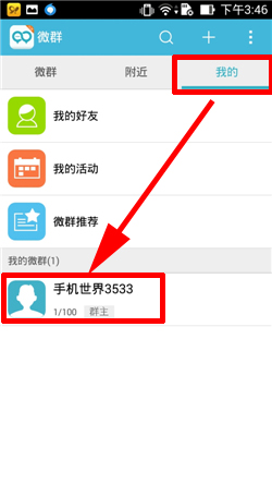 1)首先打开微群组(点击下载 iPhone版 android版 腾讯微群组),点选右上角“我的”,然后选择你要邀请成员的微群。(如下图)